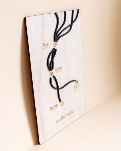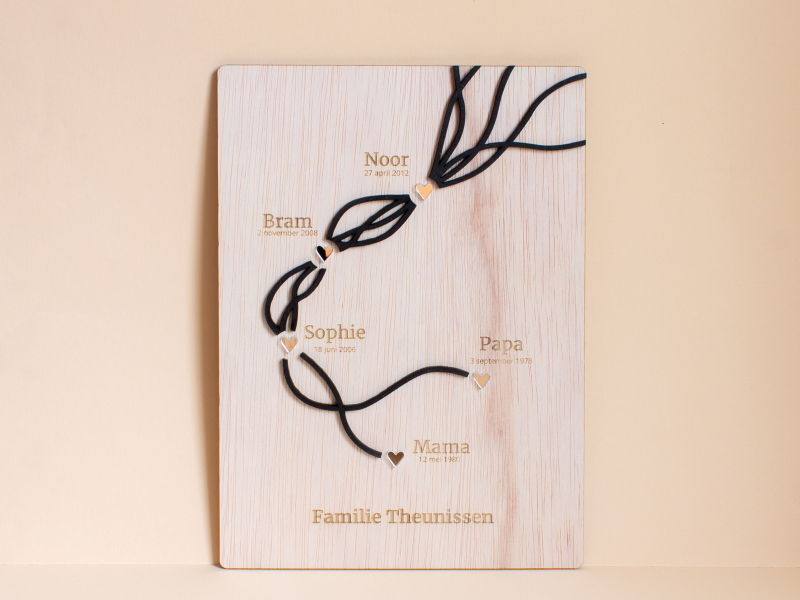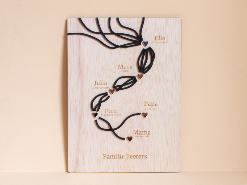 Deze unieke houten wanddecoratie vertelt het verhaal van jullie gezin. De abstracte lijnen, die elk een familielid vertegenwoordigen, vloeien samen en symboliseren de verbondenheid en het gezamenlijke levenspad. Het strakke en moderne ontwerp maakt dit een stijlvolle blikvanger in huis. Ideaal als persoonlijk cadeau voor gezinnen.